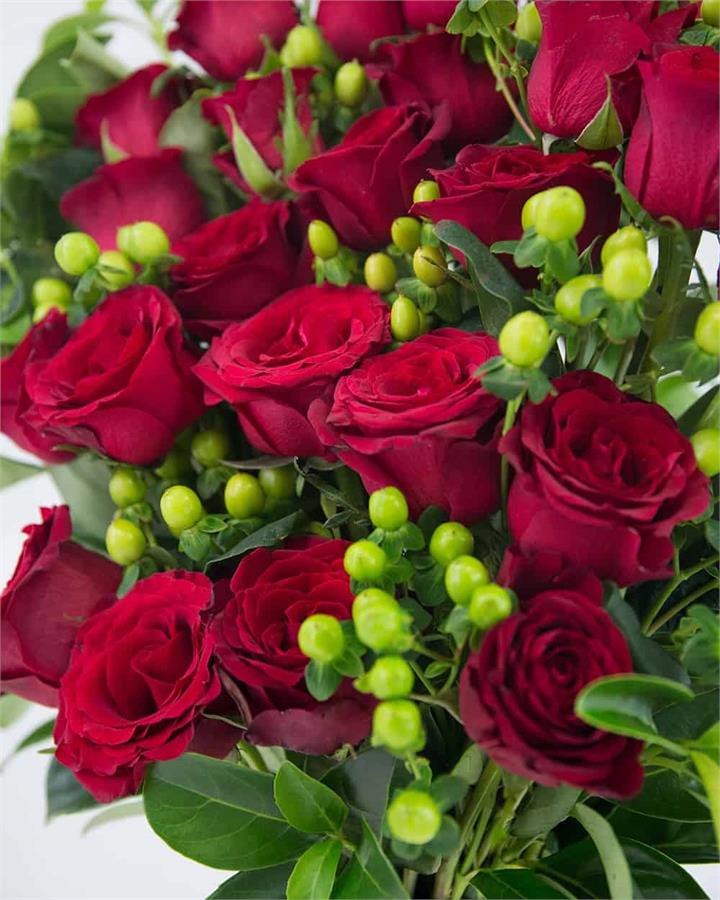 Complemented by green Hypericum berries and lush Viburnum foliage, this stunning floral design will have your flame glowing red with delight. It is the perfect way to say, “I love you”!