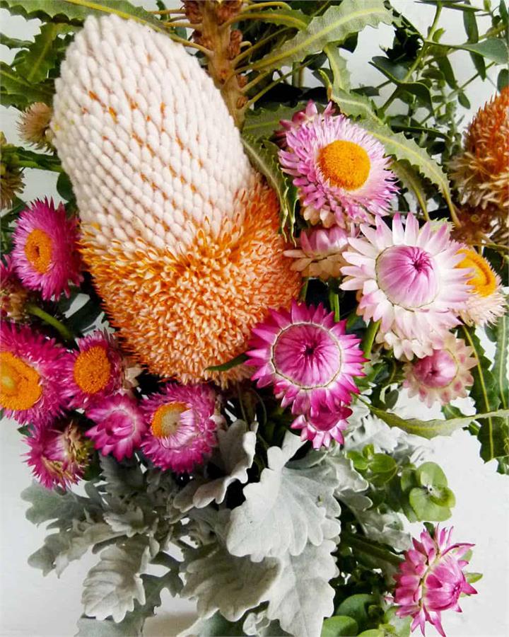 Subject to market availability this arrangement includes Banksia, Paper Daisy, Eucalyptus and Dusty Miller foliage.