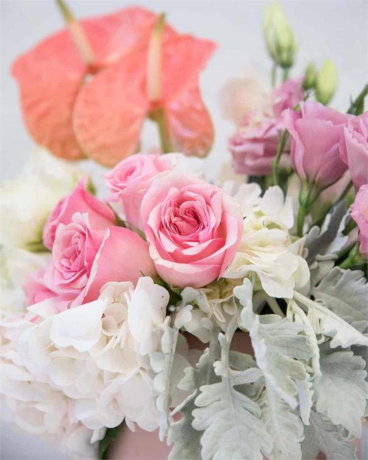 Subject to market availability this arrangement includes Roses, Hydrangea, Anthurium, Lisianthus and Snapdragon flowers with Dusty Miller and Cypress foliage.