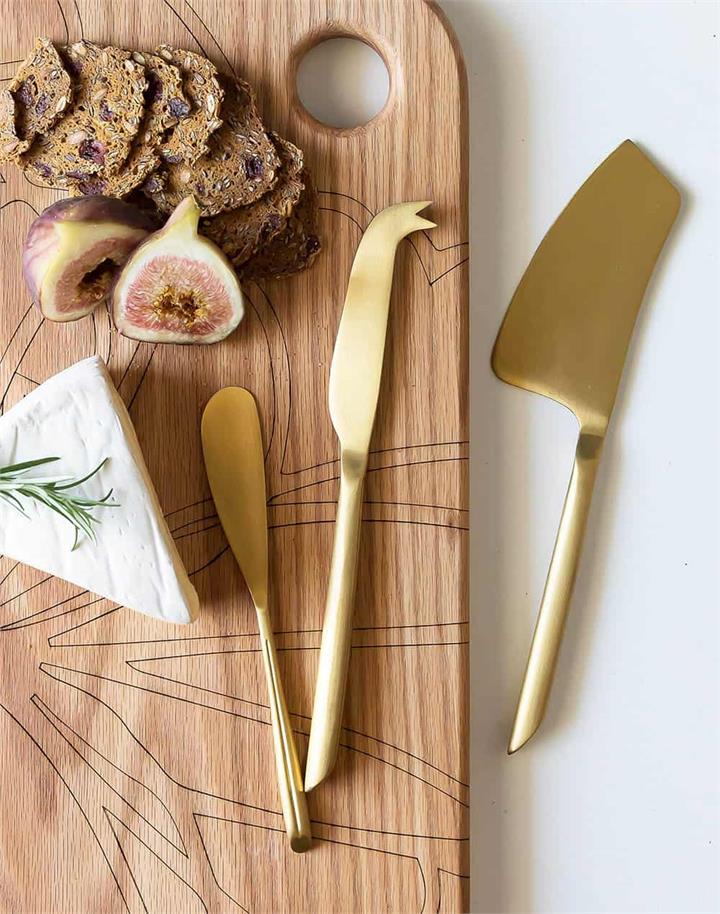 This elegant, gold luxury Cheese Knife Set is every entertainer’s dream with its rustic, stainless gold aesthetic and the choice of 3 beautifully shaped cheese knives. You have everything you need to slice and spread with our signature Fig & Bloom Cheese Knife Set.