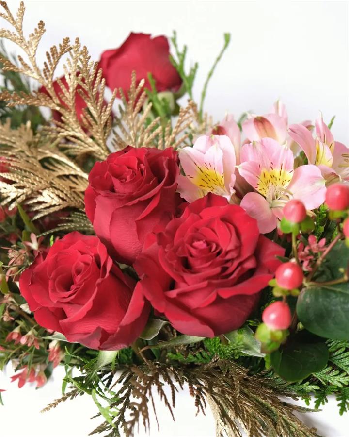 Subject to market availability this Christmas table centrepiece includes Red Roses, Christmas Bush, Hypericum, Alstroemeria and Gold Tinted Cypress.