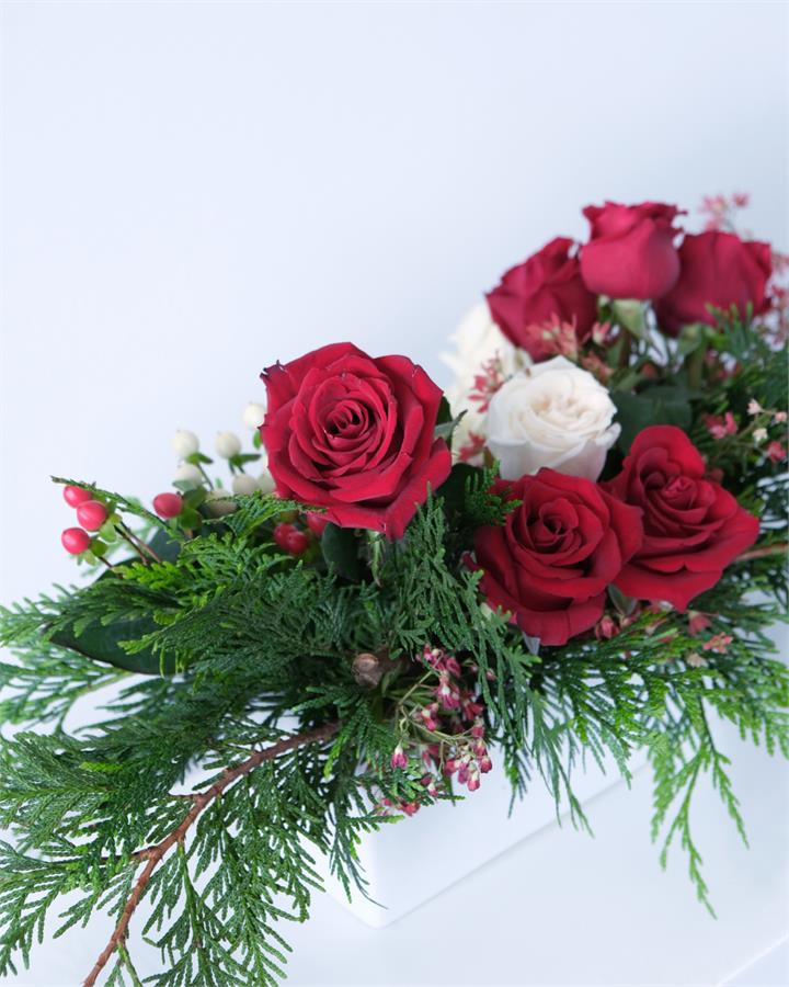 Subject to market availability this Christmas table centrepiece includes Red Roses, White Roses, Christmas Bush, Hypericum and natural Cypress.