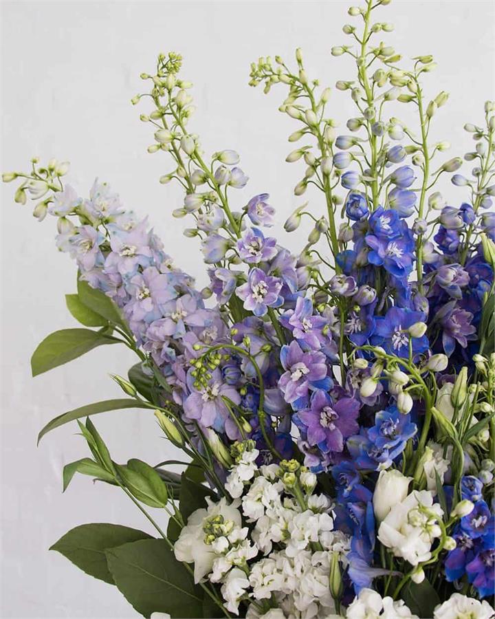 Subject to market availability this arrangement includes Delphinium, Lisianthus and Snapdragon flowers with Viburnum and Silver Suede foliage.