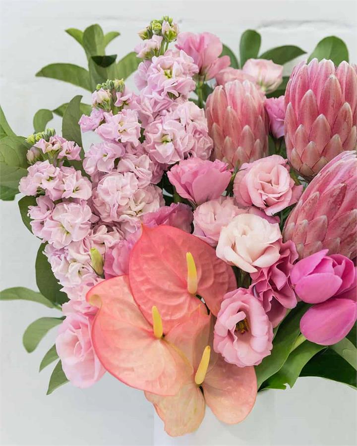 Subject to market availability this arrangement includes Tulips, Protea, Stock, Anthurium, Lisianthus and Viburnum foliage.
