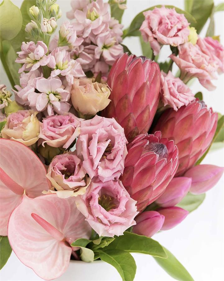 Subject to market availability this arrangement includes Tulips, Protea, Stock, Anthurium, Lisianthus and Viburnum foliage.
