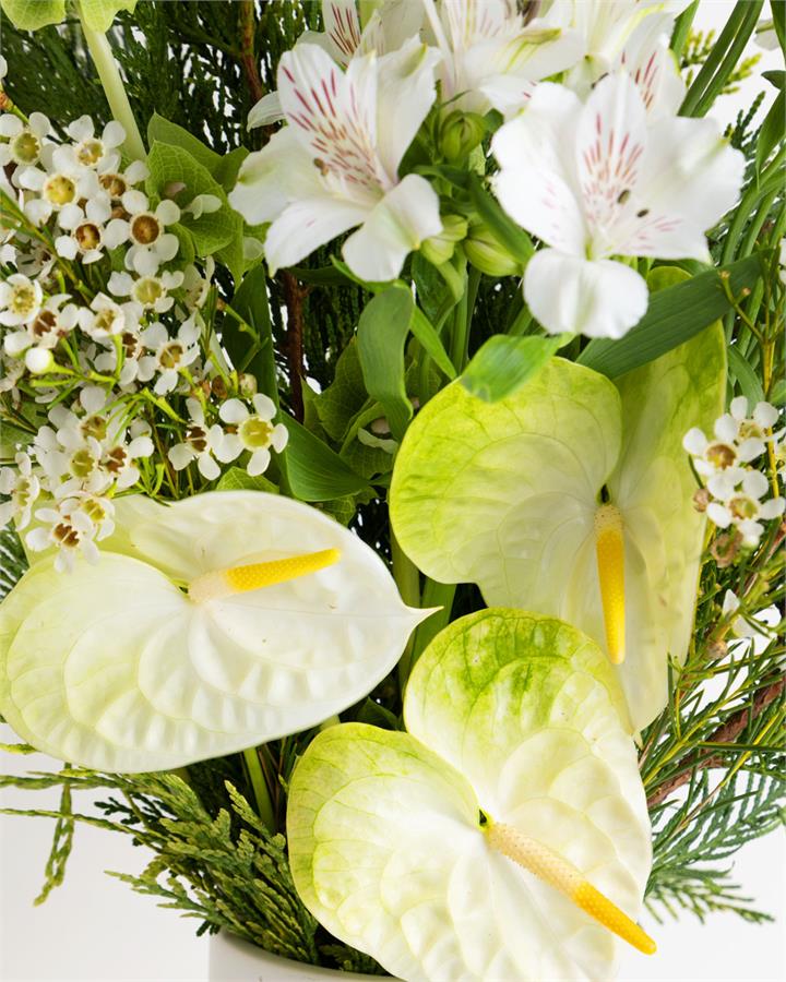 Subject to market availability this arrangement includes Molucca Balm, Anthurium, Alstroemeria, Geraldton Wax and and Cypress.