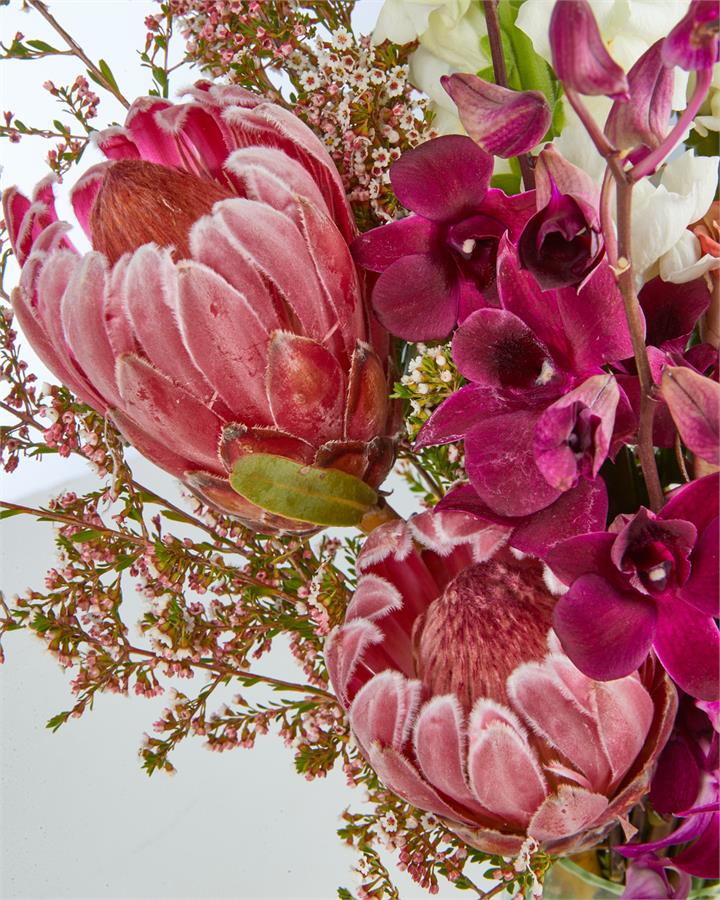 The Kinsale blends the wildflowers and coastal essence of the town from which it gets its name. This design blends wildflower inspired florals of Snapdragons, Thryptomene, Alstroemeria and Carnations with pops of colour from Roses, Proteas and Orchids. This unique blend of flowers comes in our Textured Jade Vase making it perfect for gifting!