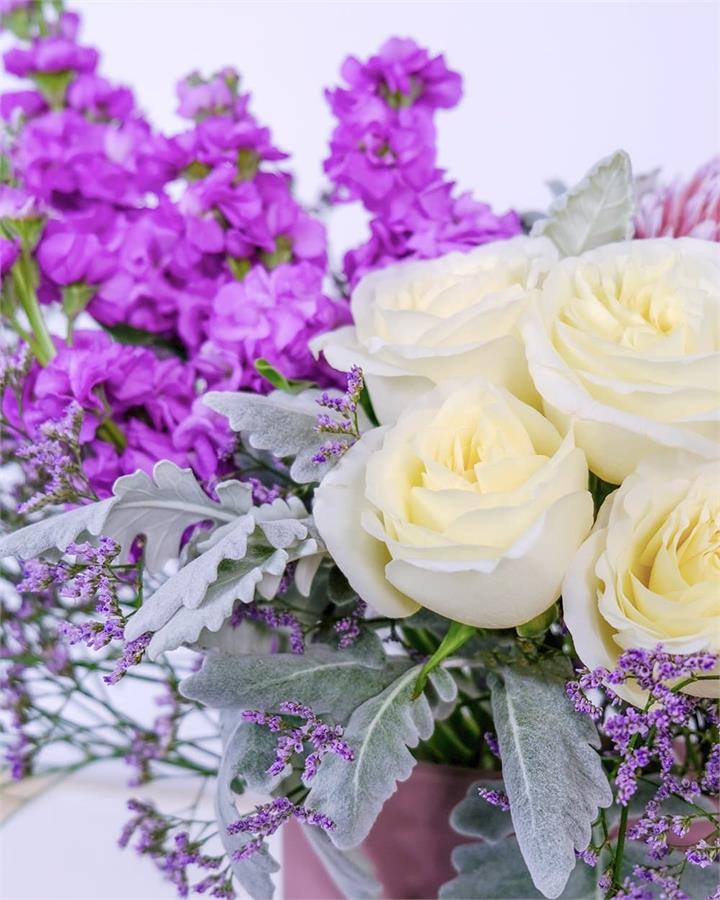 Features Chrysanthemum Disbuds, Roses, Stock, Misty and Silver Suede foliage.