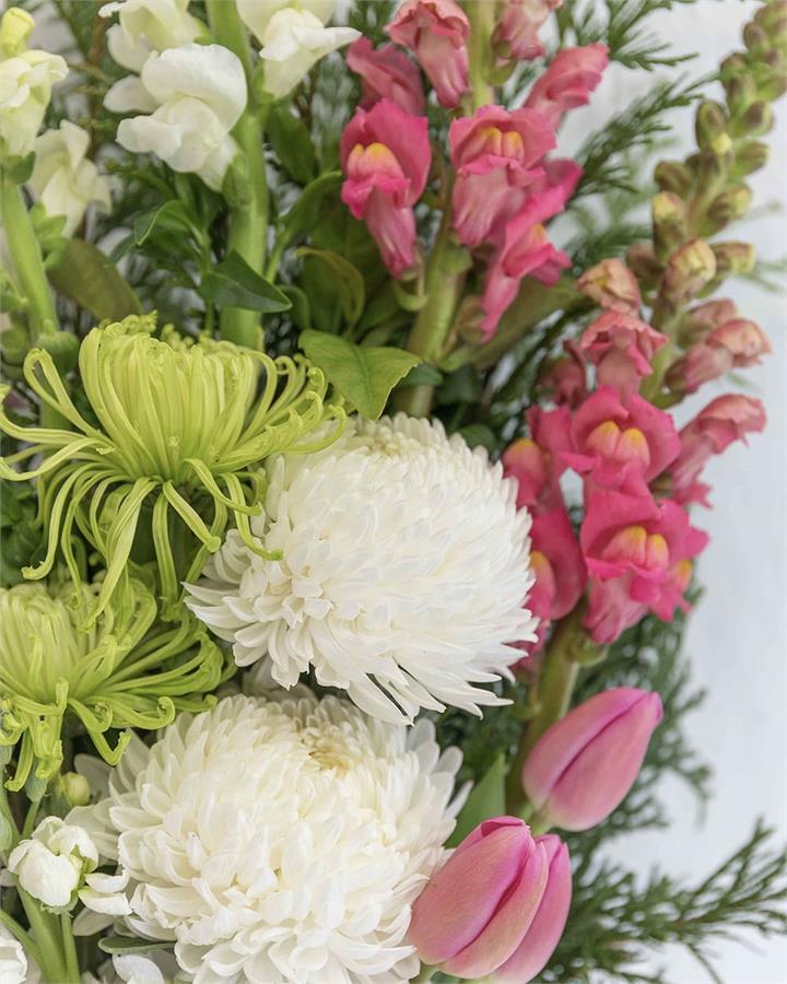 Subject to market availability this arrangement includes Stock, Snapdragon, Tulip and Chrysanthemum Disbud flowers with Cypress foliage.