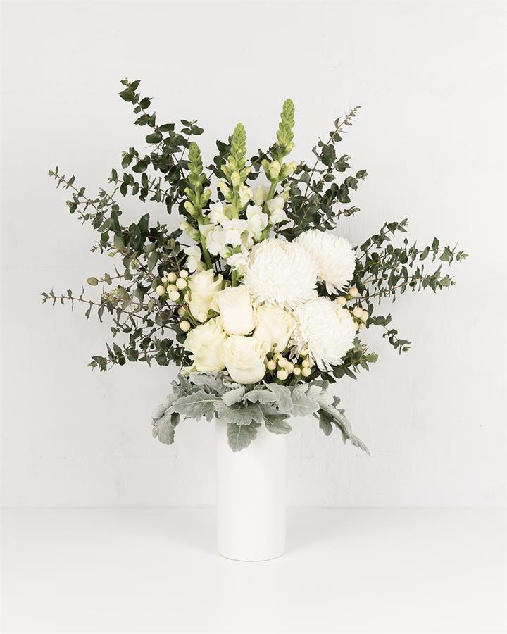 Subject to market availability this arrangement includes design includes white Roses, Chrysanthemum Disbuds, & Snapdragons all styled with Eucalyptus foliage.