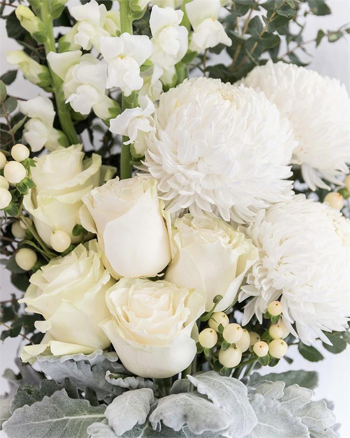 Subject to market availability this arrangement includes design includes white Roses, Chrysanthemum Disbuds, Snapdragons & Hypericum berries, all styled with Eucalyptus foliage.