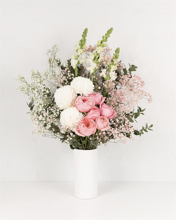Osaka features soft pink colours paired with delicate white puffs. Subject to seasonal and market availability this design includes Roses, Chrysanthemum Disbuds and Gypsophilia.