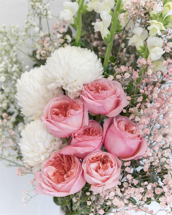 Osaka features soft pink colours paired with delicate white puffs. Subject to seasonal and market availability this design includes Roses, Chrysanthemum Disbuds and Gypsophilia.