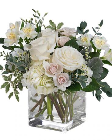 As serene as soft white clouds floating in a crisp blue sky, this elegant white rose bouquet in a simple glass cube brings peace and beauty to any occasion
