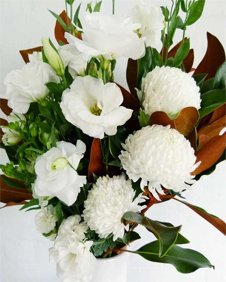 Subject to market availability this arrangement includes delicate clusters of white Lisianthus, Chrysanthemum Disbuds and Alstroemeria, backed by Magnolia foliage.