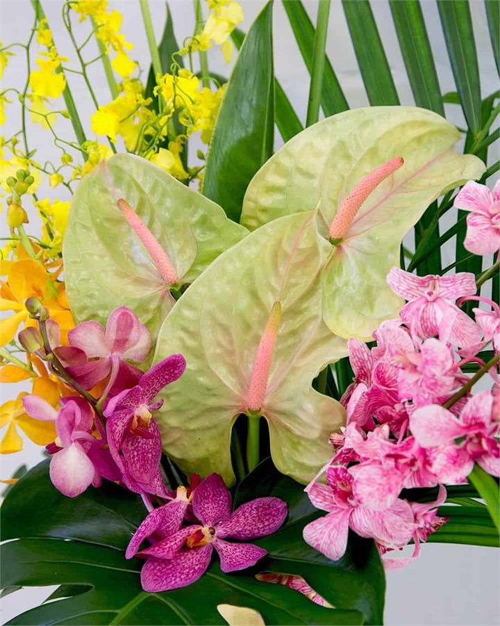 Subject to market availability this arrangement includes brightly coloured Mokara & Singapore Orchids, yellow Dancing Lady orchids, Heliconias and Anthuriums as the focal flowers. All framed in palm foliage.