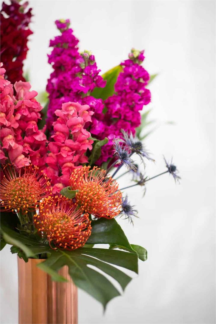 Subject to market availability this arrangement includes tropical Monstera leaves, Snapdragons, fragrant Stock flowers, Sea Holly and Pin Cushions.