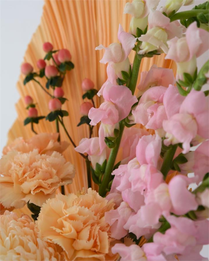 Subject to market availability this arrangement includes Hydrangea, Hypericum, Snapdragon, Chrysanthemum Disbud and an apricot Fan Palm.