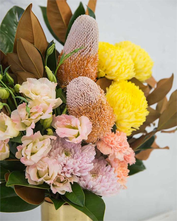 Subject to seasonal and market availability this design includes Magnolia foliage, Banskia, Lissianthus, Carnations, Yellow Pom Pom Disbuds and Local Chrysanthemum.